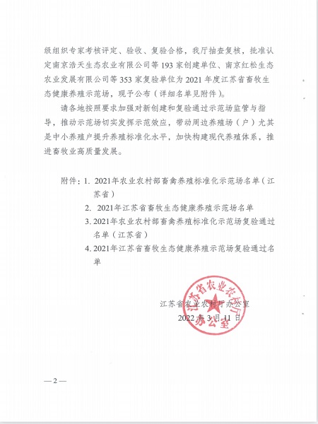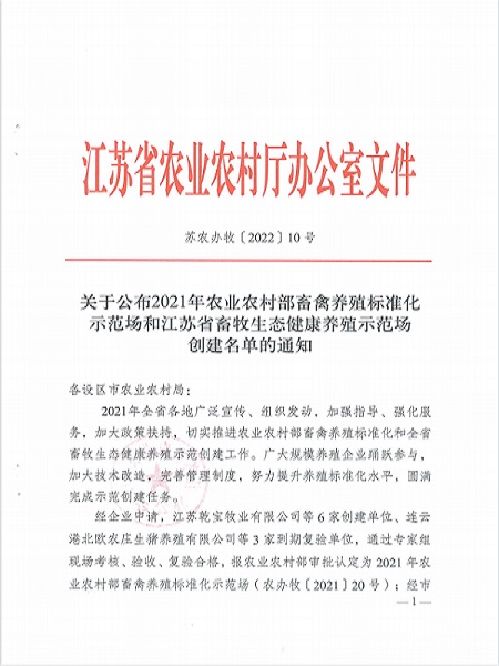 近日,高郵鴨集團從江蘇省農(nóng)業(yè)農(nóng)村辦公室文件獲悉,江蘇高郵鴨發(fā)展集團有限公司獲評“2021年江蘇省畜牧生態(tài)健康養(yǎng)殖示范場”。