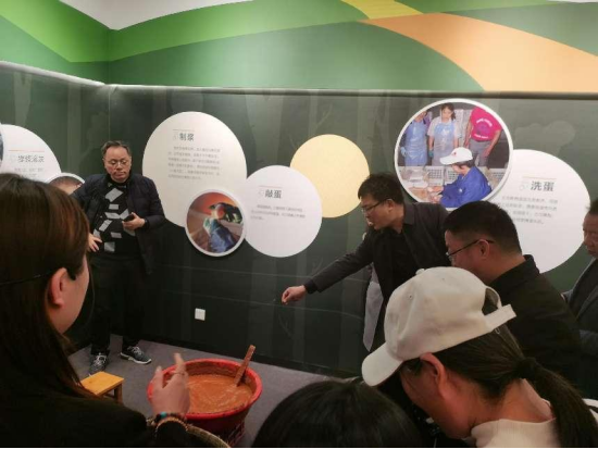 采風團一行走進公司高郵鴨展覽館,饒有興趣的沿著展覽墻參觀公司發展歷程、高郵鴨的生活習性介紹及可視化的1:1標本。通過直觀化的體驗,更能感受歷代文人對高郵鴨和鴨蛋的美好評價。