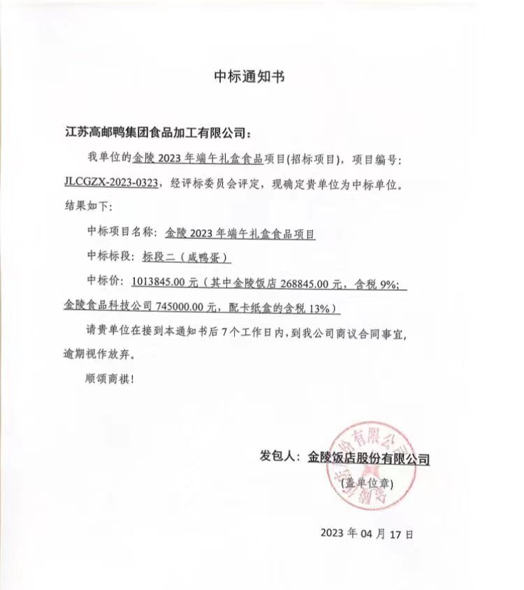 高郵鴨集團成功中標南京金陵飯店2023年端午禮盒食品項目