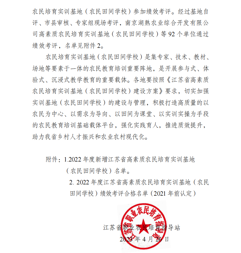 經過前期省市兩級審核、專家組現場評審,近日,江蘇省職業農民培育指導站公布了2022年度省級高素質農民培育實訓基地(農民田間學校)考評結果,高郵鴨集團成功獲評。