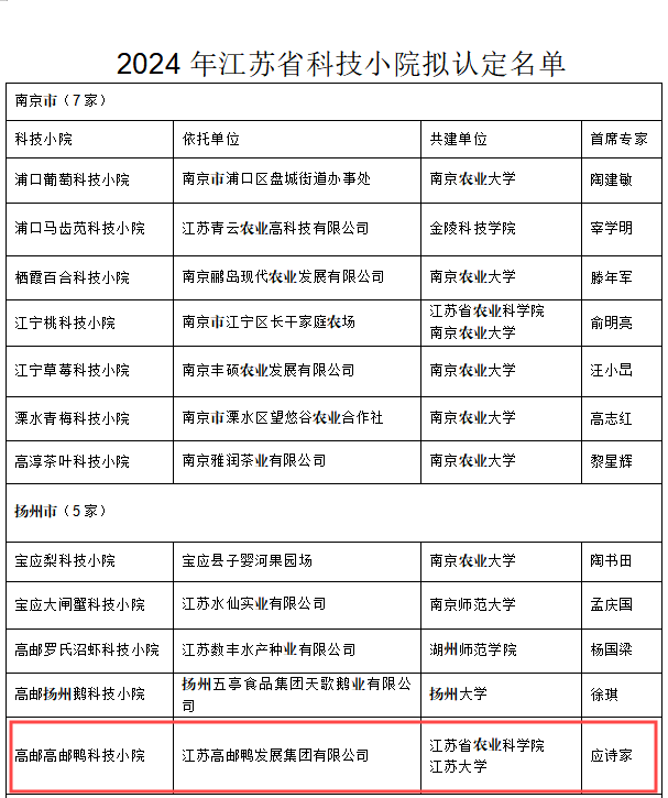 近日,江蘇省科學(xué)技術(shù)協(xié)會(huì)公示了關(guān)于2024年江蘇省科技小院擬認(rèn)定名單,根據(jù)江蘇省科協(xié)《關(guān)于組織申報(bào)2024年江蘇省科技小院的通知》(蘇科協(xié)辦發(fā)〔2024〕38號(hào))的要求,經(jīng)過(guò)前期申報(bào)、市級(jí)初審、形式審查、專家評(píng)審以及省科協(xié)行政辦公會(huì)審議等程序,由高郵鴨集團(tuán)牽頭申報(bào)的“高郵高郵鴨科技小院”成功入選江蘇省科技小院認(rèn)定名單。
