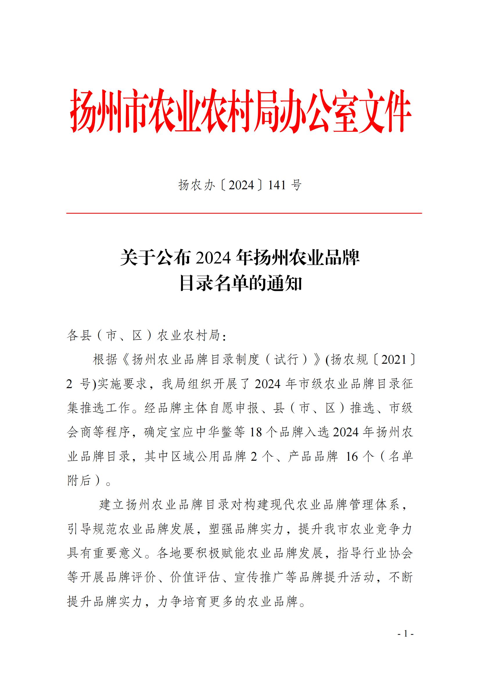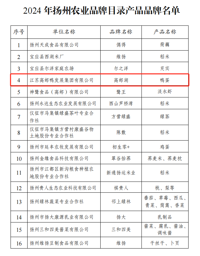 近日,揚州市農業農村局公布了2024年揚州農業品牌目錄名單,高郵鴨集團“高郵湖”品牌鴨蛋成功入選目錄名單。