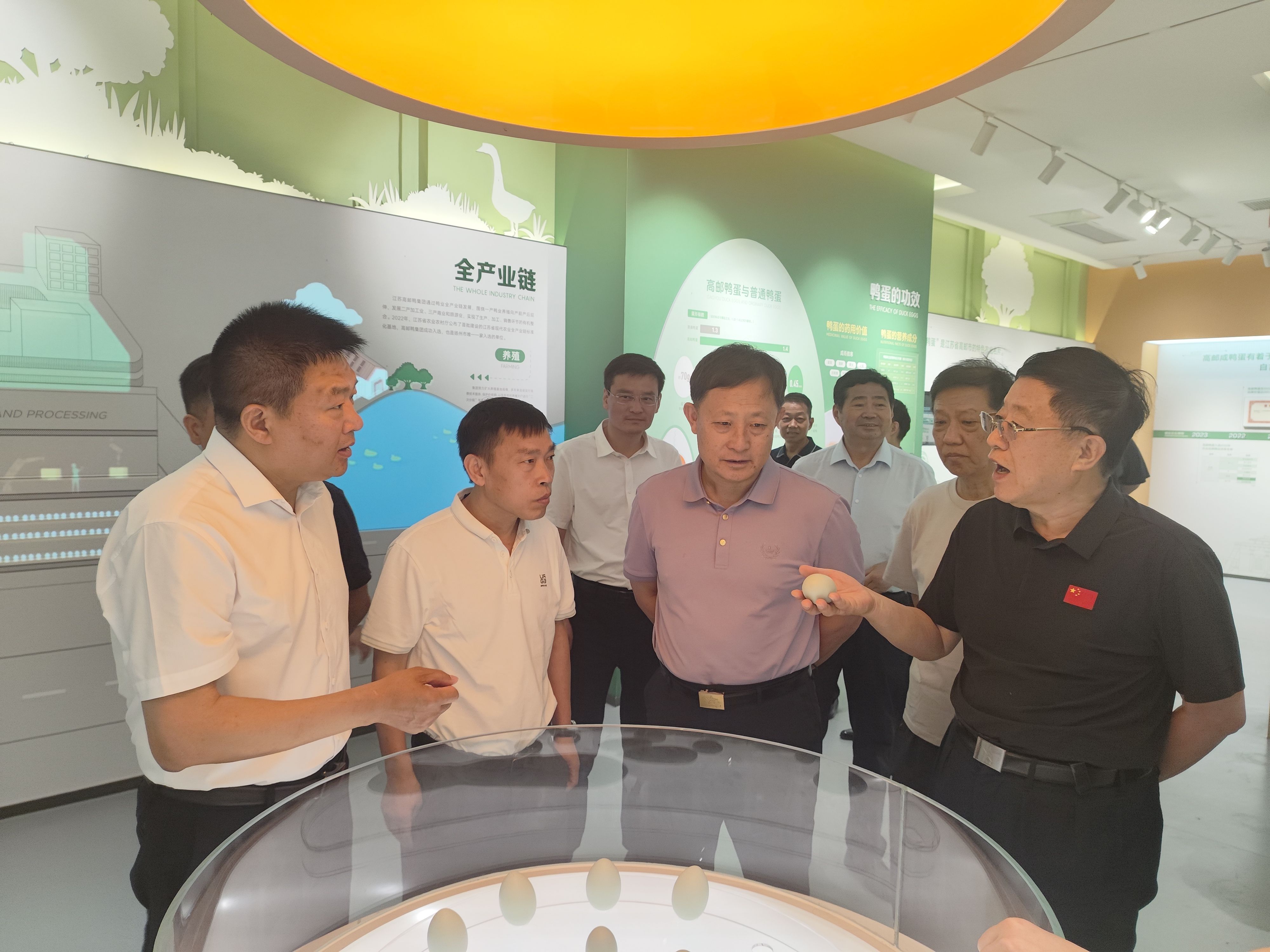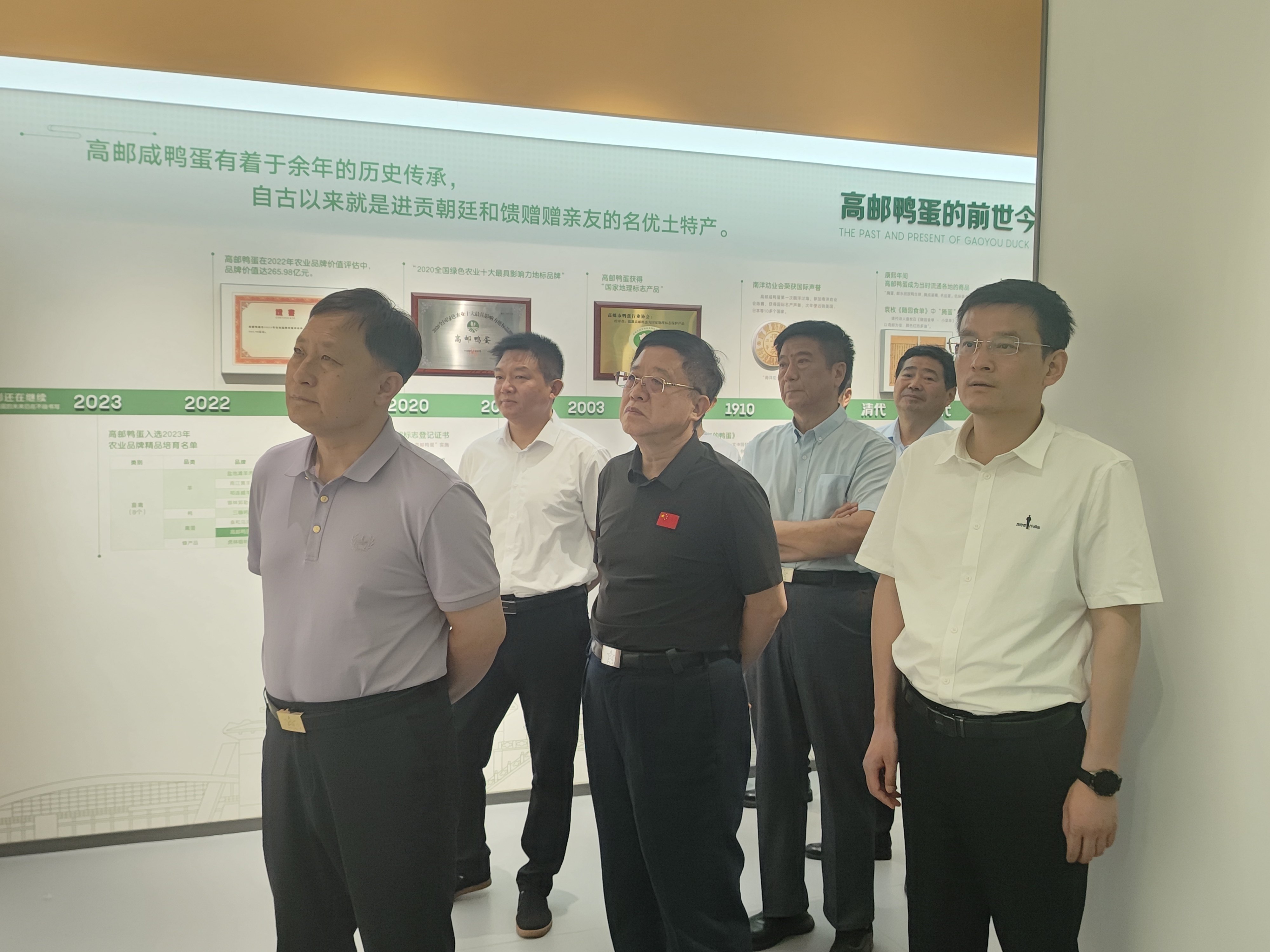 臧傳勛一行先后實(shí)地考察高郵鴨集團(tuán)文化展廳、食品加工標(biāo)準(zhǔn)化一期廠房及養(yǎng)殖基地,詳細(xì)聽取了關(guān)于高郵鴨蛋的歷史淵源、高郵鴨集團(tuán)發(fā)展歷程、高郵鴨現(xiàn)代化養(yǎng)殖及高郵鴨蛋加工銷售等方面的介紹。