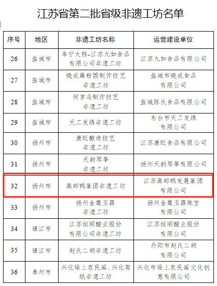 近日,江蘇省文化和旅游廳正式公布第二批省級非遺工坊名單,高郵鴨集團憑借“高郵咸鴨蛋制作技藝”成功入選。